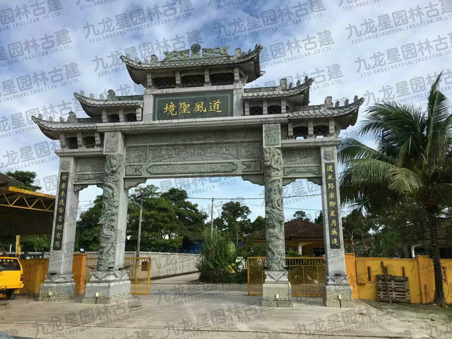 牌坊集中了中國古建筑最有特征的構(gòu)件組成,有臺座、柱身(包括夾桿石)、梁坊、樓匾、斗拱、樓頂?shù)葮?gòu)件。石造牌坊材質(zhì)堅固敦實牢靠,且可仿照木結(jié)構(gòu)造型。在藝術(shù)處理上,可以在夾桿石、柱子、額坊等處,雕刻各式各樣的花鳥、圖案、龍鳳及各種瑞獸等等,將中國傳統(tǒng)的石刻藝術(shù)集中于一身表現(xiàn)出來。中國民俗專家講:“石雕不開光是石雕工藝品,開光后就是具有靈氣的風(fēng)水神器。”所以“非寧靜無以致遠,非精誠無以神明。” 石牌坊是用石修建的牌坊,是一種裝飾建筑物。柱石的上方刻有麒麟、獅子,夾柱石的浮雕有雙獅戲彩珠,牌坊上還雕刻著其他怪獸云紋。兩側(cè)基石柱各有撐鼓,石柱兩側(cè)配有石獅。牌坊運用浮雕、透雕等手法,是我國建筑藝術(shù)的一大特色。