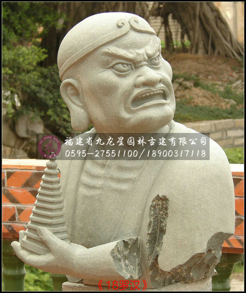 十八羅漢半身像雕塑采用天然優質石材花崗巖精雕而成,因為花崗巖的自然感染力,加上十八尊羅漢像惟妙惟肖,神態栩栩如生,使得整套羅漢雕像與園林形成渾然一體的感覺。